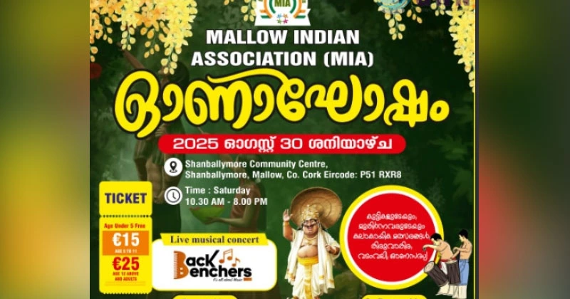 കോർക്ക്: വിപുലമായ ഓണാഘോഷം സംഘടിപ്പിക്കാൻ മാലോ ഇന്ത്യൻ അസോസിയേഷൻ (എംഐഎ). അടുത്ത മാസം 30 ന് (ശനിയാഴ്ച) ഷാൻബാലിമോർ കമ്മ്യൂണിറ്റി സെന്ററിലാണ് ആഘോഷ പരിപാടികൾ നടക്കുക. പരിപാടിയുടെ ഭാഗമാകാൻ ആഗ്രഹിക്കുന്നവർക്ക് ടിക്കറ്റുകൾ മുൻകൂട്ടി ബുക്ക് ചെയ്യാം.