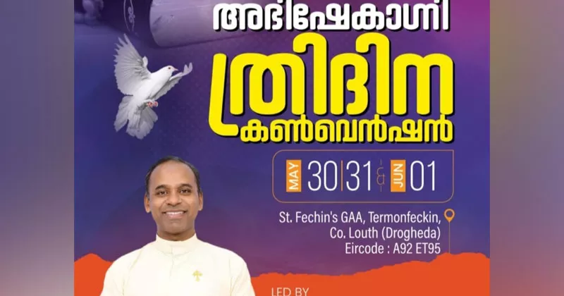 ലൗത്ത്: അനോയിന്റിംഗ് ഫയർ കാത്തലിക് മിനിസ്ട്രിയുടെ ത്രിദിന ബൈബിൾ കൺവെൻഷൻ മെയിൽ. അഭിഷേകാഗ്നി എന്ന് പേര് നൽകിയിരിക്കുന്ന കൺവെൻഷൻ മെയ് 30, 31, ജൂൺ 1 എന്നീ തിയതികളിൽ നടക്കും. കൗണ്ടി ലൗത്തിലെ ടെർമോൺഫെക്കിനിലെ സെന്റ് ഫെച്ചിൻ ജിഎഎ ഹാളിൽ ആണ് പരിപാടി നടക്കുക.