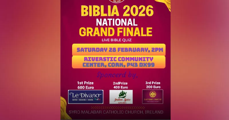 ഡബ്ലിൻ: ഓൾ അയർലൻഡ് സീറോ- മലബാർ ബൈബിൾ ക്വിസ് ഫൈനൽ മത്സരങ്ങൾ ശനിയാഴ്ച. കോർക്കിലെ റിവർസ്റ്റിക് കമ്യൂണിറ്റി സെന്ററിലാണ് ഫൈനൽ മത്സരം നടക്കുക. ശനിയാഴ്ച ഉച്ചയ്ക്ക് രണ്ട് മണിയ്ക്കാണ് പരിപാടി. 12 ടീമുകളാണ് വാശിയേറിയ പോരാട്ടത്തിൽ മാറ്റുരയ്ക്കുന്നത്.