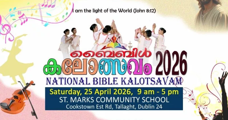 ഡബ്ലിൻ: സിറോ മലബാർ സഭയുടെ പ്രഥമ ബൈബിൾ കലോത്സവം ഈ മാസം 25 ന്. ഡബ്ലിനിലെ താലയിൽവച്ചാണ് പരിപാടി സംഘടിപ്പിക്കുന്നത്. രാവിലെ 9 മണി മുതൽ പരിപാടികൾ ആരംഭിക്കും.