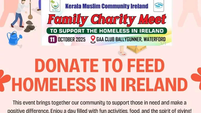 ഡബ്ലിൻ: കേരളാ മുസ്ലീം കമ്യൂണിറ്റി അയർലൻഡിന്റെ ഫാമിലി ചാരിറ്റി മീറ്റ് ഈ മാസം 11 ന് (ശനിയാഴ്ച) നടക്കും. ഉച്ചയ്ക്ക് 1 മുതൽ വൈകീട്ട് 5 മണിവരെയാണ് പരിപാടി. ഡൊണേറ്റ് ടു ഫീഡ് ദി ഹോംലസ് ഇൻ അയർലൻഡ് എന്ന പേരിലാണ് പരിപാടി സംഘടിപ്പിക്കുന്നത്.