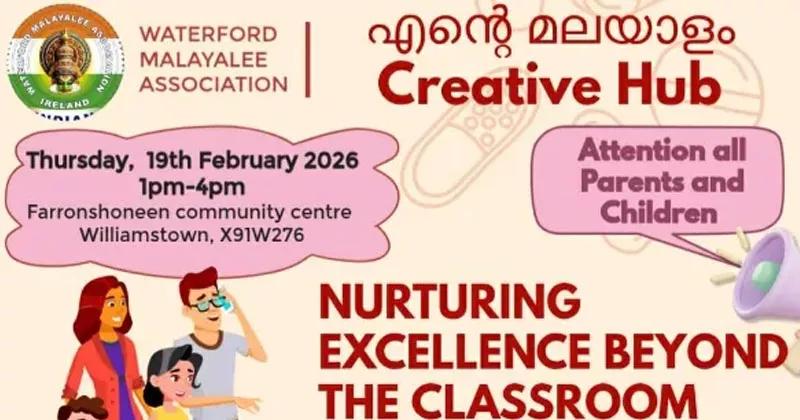 ടിപ്പററി: വിദ്യാർത്ഥികൾക്കും രക്ഷിതാക്കൾക്കും എന്റെ മലയാളം ക്രിയേറ്റീവ് ഹബ്ബ് ഓപ്പൺ ഫോറവുമായി വാട്ടർഫോർഡ് മലയാളി അസോസിയേഷൻ. നാളെ ( ഫെബ്രുവരി 19) ഫാരോൺഷോനീൻ യൂത്ത് ആൻഡ് കമ്യൂണിറ്റി സെന്ററിലാണ് പരിപാടി. ക്ലാസ് മുറികൾക്കപ്പുറത്തേയ്ക്ക് കുട്ടികളെ കൈപിടിച്ച് നയിക്കാൻ എന്ത് ചെയ്യാം എന്നതിനെക്കുറിച്ചാകും ഫോറം ചർച്ച ചെയ്യുക.