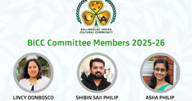 ബാലിനസ്ലോ: അയർലന്റിലെ ബാലിനസ്സ്ലോ ഇന്ത്യൻ കൾച്ചറൽ കമ്മ്യൂണിറ്റി (ബിഐസിസി)യ്ക്ക് പുതിയ ഭാരവാഹികൾ. 2025-26 വർഷത്തേക്കുള്ള പ്രസിഡന്റായി ലിൻസി ഡോൺബോസ്കോയെ തിരഞ്ഞെടുത്തു. ഷിബിൻ സജി ഫിലിപ്പ് സെക്രട്ടറിയായും, ആശ ഫിലിപ്പ് ട്രഷററായും തിരഞ്ഞെടുക്കപ്പെട്ടു.