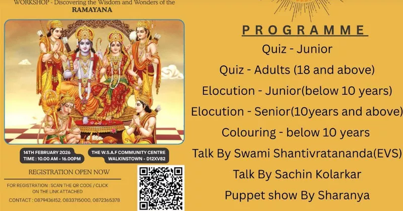 ഡബ്ലിൻ: സനാതന അയർലൻഡ് സംഘടിപ്പിക്കുന്ന രാമായണ വർക്ക്ഷോപ്പിന്റെ രജിസ്ട്രേഷന് തുടക്കമായി. ഈ വരുന്ന 14 ന് രാവിലെ 10 മുതൽ വൈകീട്ട് 4 മണിവരെയാണ് പരിപാടി. വാക്കിംഗ്സ്ടൗണിലുള്ള ഡബ്ല്യു എസ് എഫ് കമ്യൂണിറ്റി സെന്ററിൽ ആയിരുന്നു പരിപാടി.