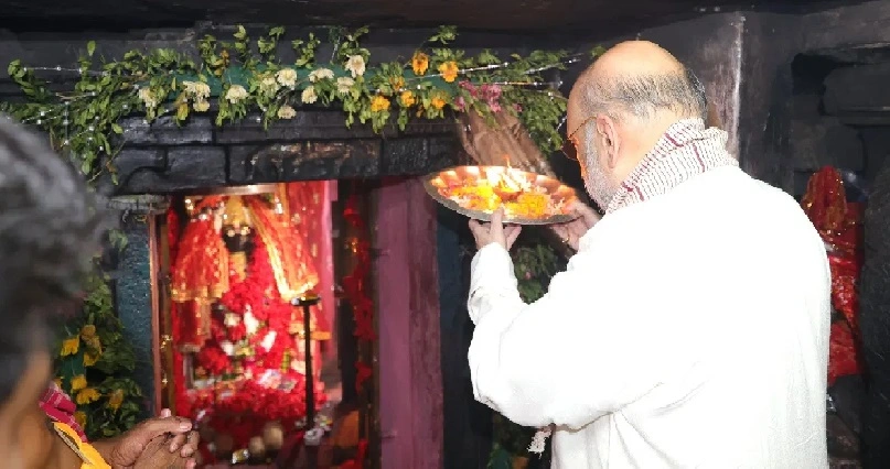 പുഷ്പങ്ങളും, പട്ടും സമർപ്പിച്ച അമിത് ഷാ പ്രത്യേക പൂജകളും ക്ഷേത്രത്തിൽ നടത്തി . ഷാൾ അണിയിച്ചാണ് ക്ഷേത്ര അധികൃതർ അമിത് ഷായെ സ്വീകരിച്ചത്.