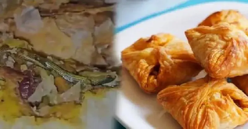 ജാഡ്ചർല : ബേക്കറിയിൽ നിന്ന് വാങ്ങിയ പഫ്സിൽ ചത്തപാമ്പിനെ കണ്ടെത്തി . തെലങ്കാനയിലെ ഒരു ബേക്കറിയിൽ നിന്ന് വാങ്ങിയ പഫ്സിനുള്ളിൽ നിന്നാണ് ചത്ത പാമ്പിനെ കണ്ടെത്തിയത് .