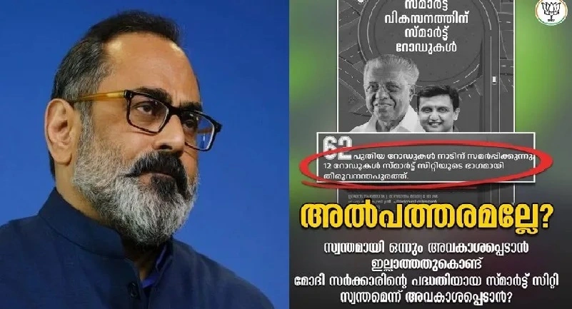 തിരുവനന്തപുരം : നരേന്ദ്ര മോദി സർക്കാരിൻ്റെ പദ്ധതിയായ സ്മാർട്ട് സിറ്റിയുടെ ഭാഗമായുള്ള തിരുവനന്തപുരത്തെ 12 സ്മാർട്ട് റോഡുകൾ സ്വന്തം എന്ന് അവകാശപ്പെടുകയാണ് പിണറായി സർക്കാരെന്ന് ബിജെപി സംസ്ഥാന അദ്ധ്യക്ഷൻ രാജീവ് ചന്ദ്രശേഖർ . . രാജ്യത്തെ 100 സ്മാർട്ട് നഗരങ്ങളിൽ ഒന്നായി തിരുവനന്തപുരത്തെ കേന്ദ്ര നഗരവികസന മന്ത്രാലയം തിരഞ്ഞെടുത്താണ് ഈ പദ്ധതി നടപ്പിലാക്കിയത്.